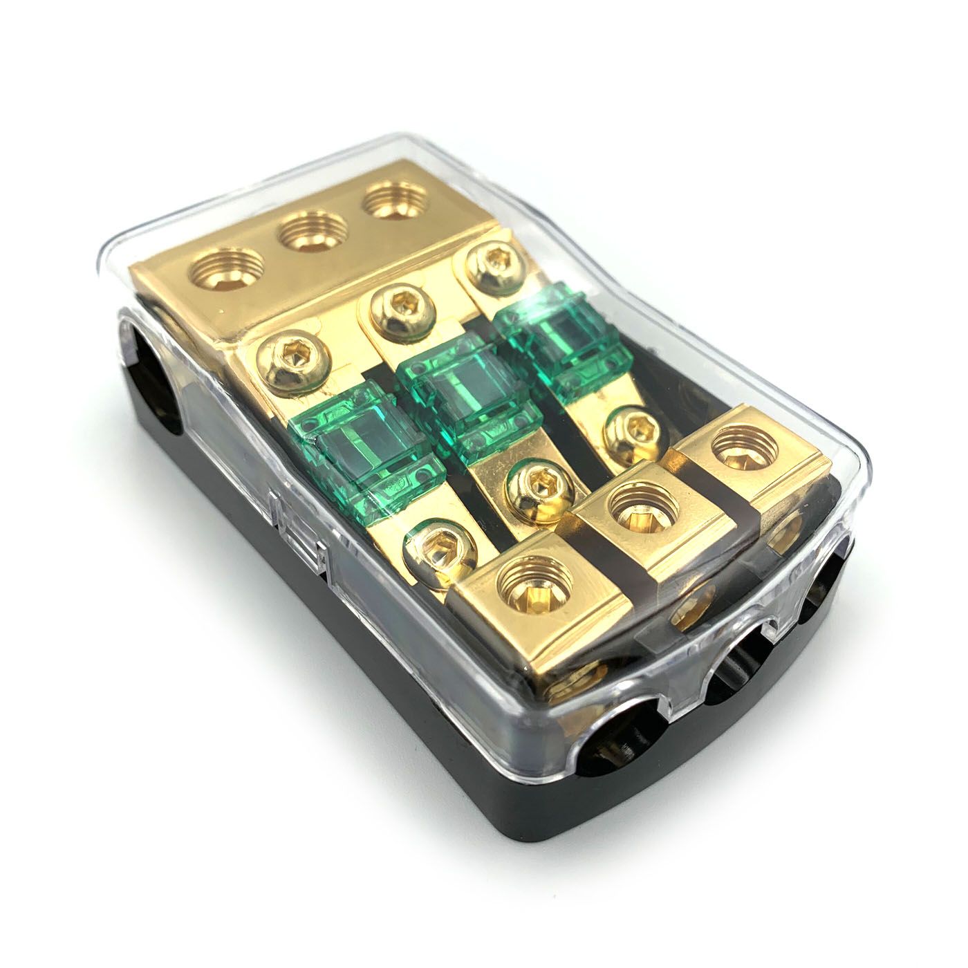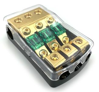 Uyava FH3 - Автомобільний дистрибютор живлення. 3x0-2GA (53-35 мм2) - вхід та 3x8-4GA (8-21 мм2) - вихід . Тримач для запобіжнику типу miniANL. Три запобіжника на 60А у комплекті. Контакти мають позолоту для кращої провідності.