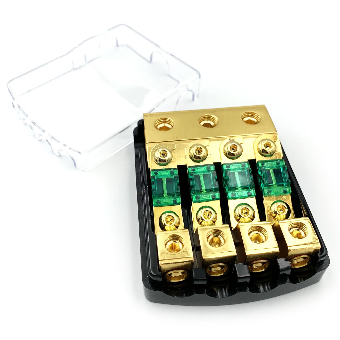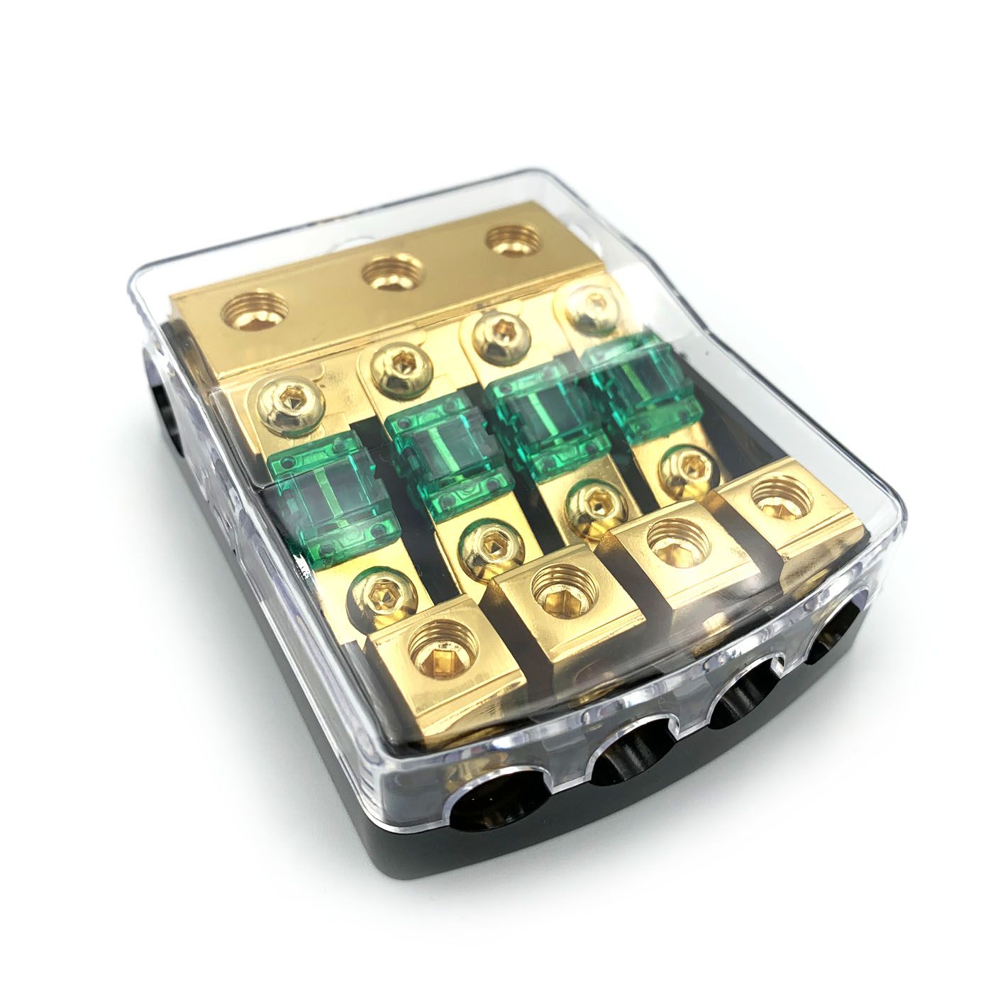 Uyava FH4 - Автомобільний дистрибютор живлення. 3x0-2GA (53-35 мм2) - вхід та 4x8-4GA (8-21 мм2) - вихід . Тримач для запобіжнику типу miniANL. Чотири запобіжника на 60А у комплекті. Контакти мають позолоту для кращої провідності.
