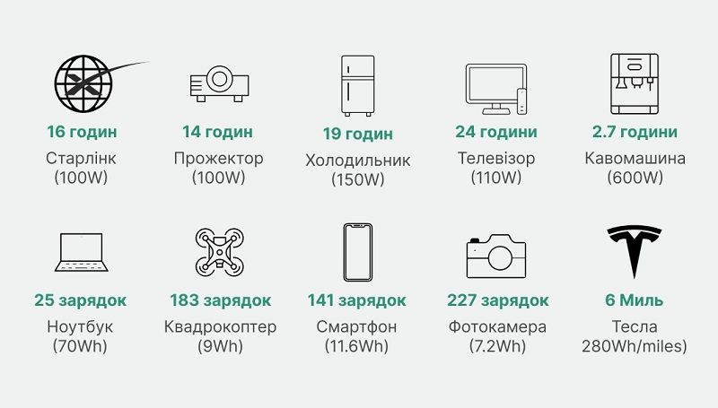 - Живити одночасно ноутбуки, роутер, світло та заряджати гаджети