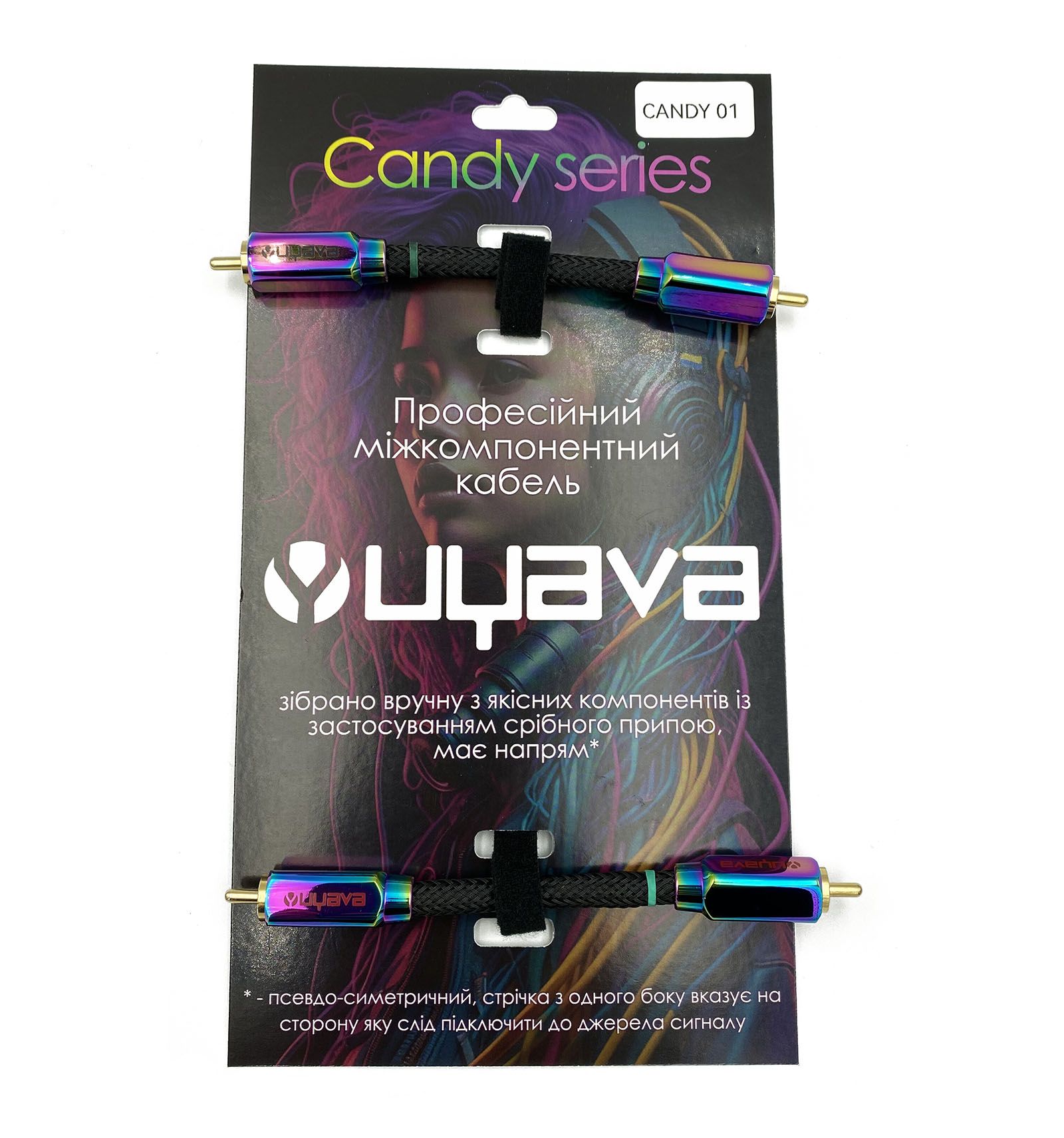 Uyava Candy 01 – професійний міжблочний (міжкомпонентний) кабель, довжина 0,1 м. 2 канали, серія Candy. Унікальний дизайн конекторів для ще більшої ексклюзивності вашої аудіосистеми. Провідники із чистої міді. Кабель зібраний вручну з якісних компонентів із застосуванням срібного припою та флюсом, що не провокує окислення. Зовнішньо додатково захищений обплетенням "зміїна шкіра". Кабель псевдо-балансний – має напрямок. Зелена мітка вказує сторону підключення до джерела сигналу.