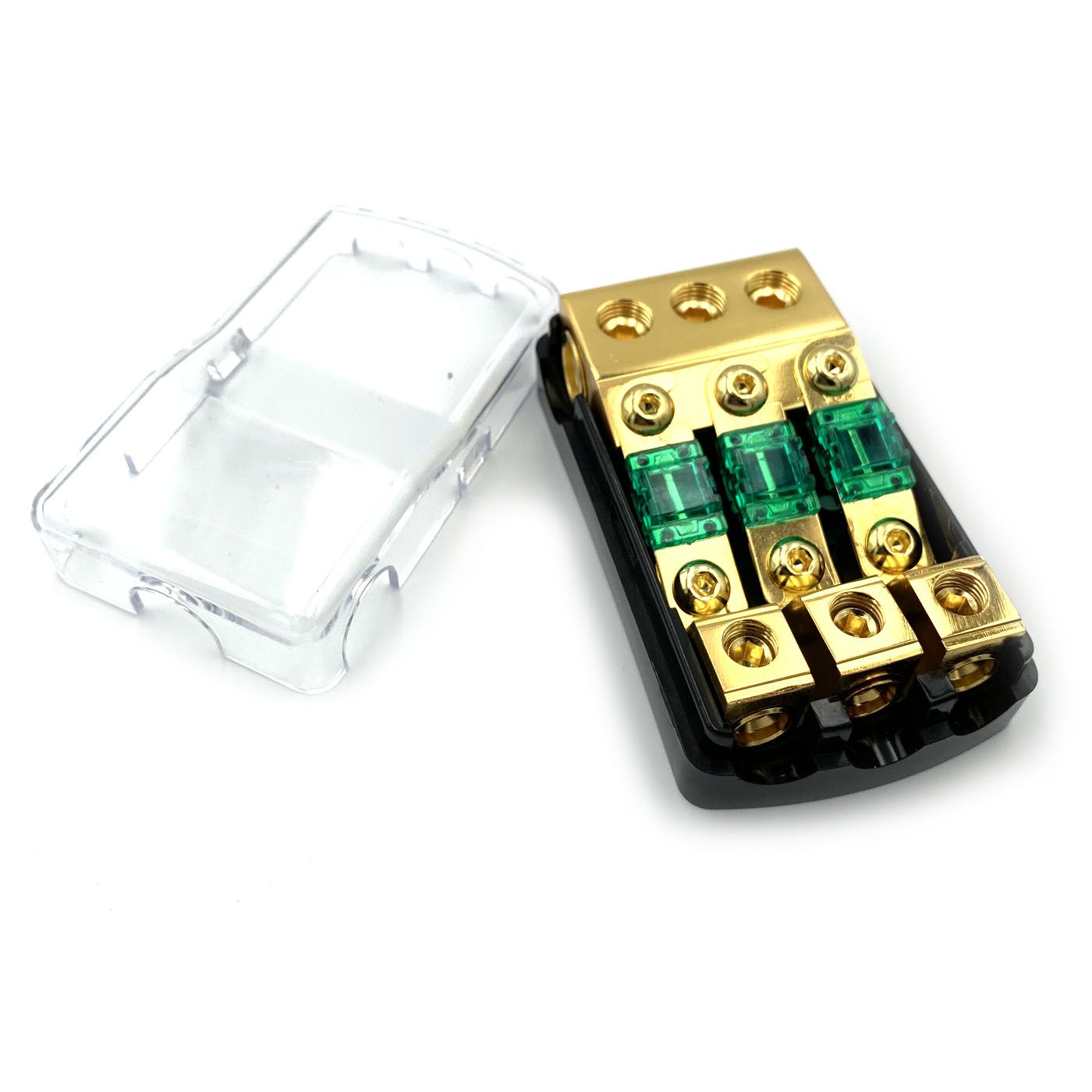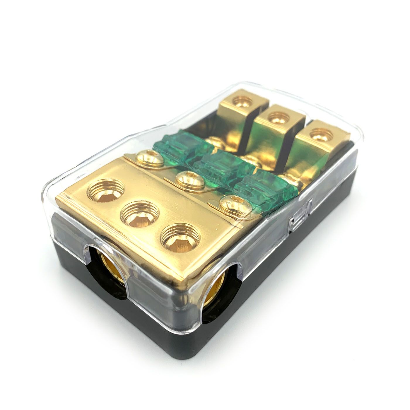 Uyava FH3 - Автомобільний дистрибютор живлення. 3x0-2GA (53-35 мм2) - вхід та 3x8-4GA (8-21 мм2) - вихід . Тримач для запобіжнику типу miniANL. Три запобіжника на 60А у комплекті. Контакти мають позолоту для кращої провідності.