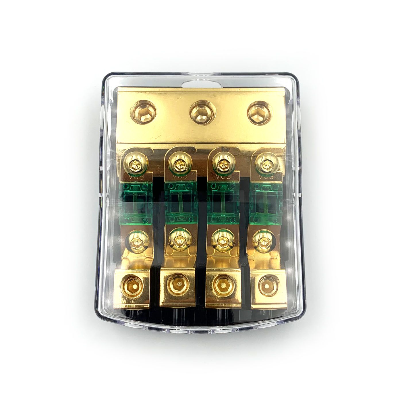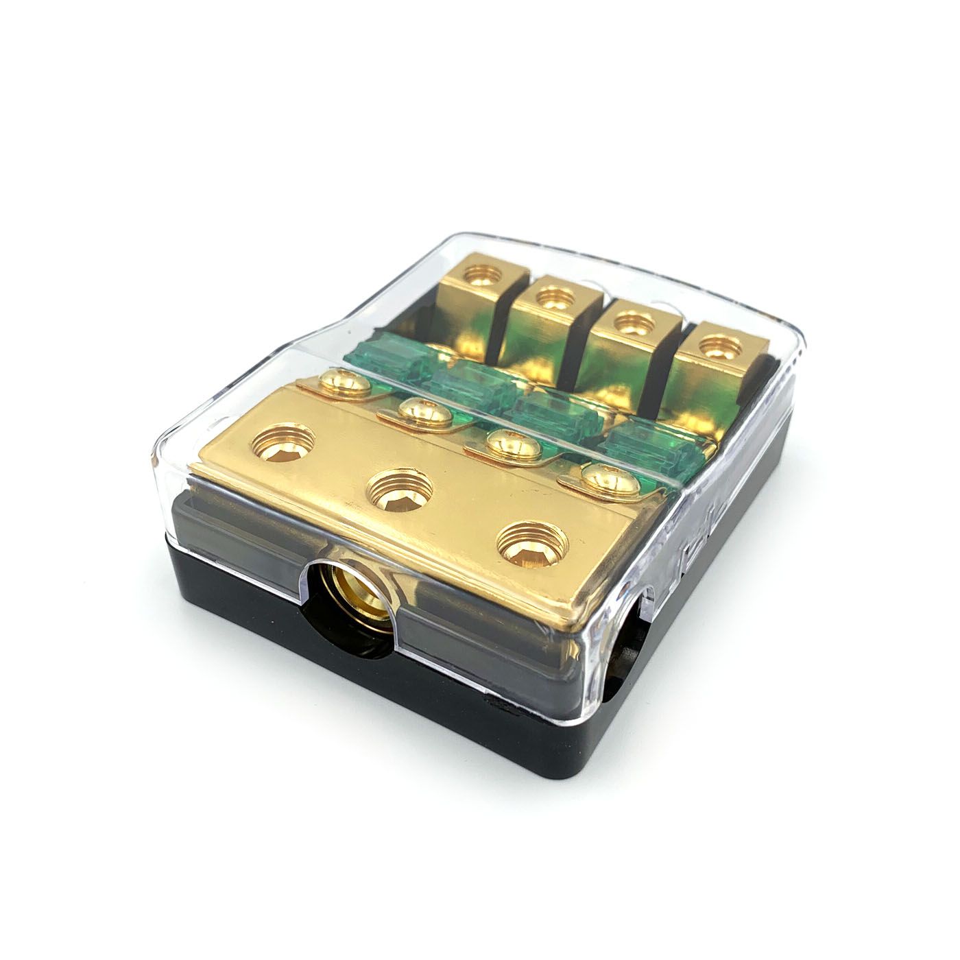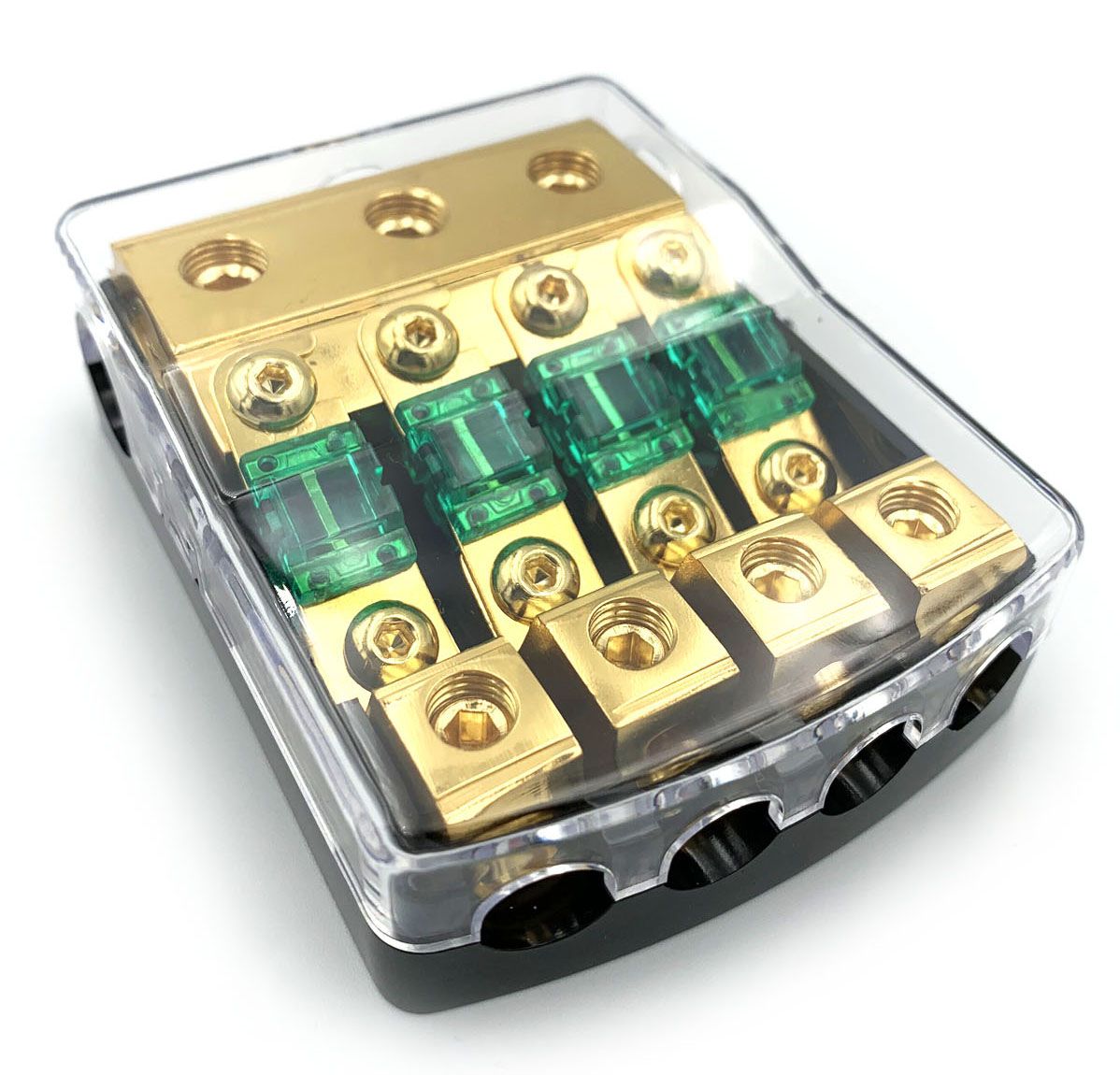 Uyava FH4 - Автомобільний дистрибютор живлення. 3x0-2GA (53-35 мм2) - вхід та 4x8-4GA (8-21 мм2) - вихід . Тримач для запобіжнику типу miniANL. Чотири запобіжника на 60А у комплекті. Контакти мають позолоту для кращої провідності.