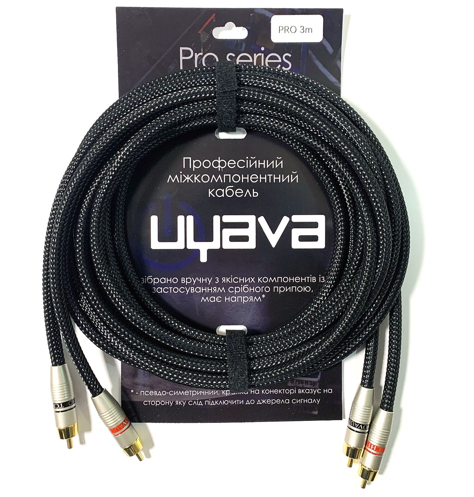Uyava PRO 2RCA-3 – професійний міжблочний (міжкомпонентний) кабель, довжина 3 м. 2 канали, серія Pro. Провідники із чистої міді. Кабель зібраний вручну з якісних компонентів із застосуванням срібного припою та флюсом, що не провокує окислення. Зовнішньо додатково захищений обплетенням "зміїна шкіра". Кабель псевдо-балансний – має напрямок. Крапка вказує сторону підключення до джерела сигналу.